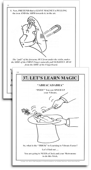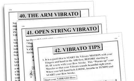 Once Vibrato study is started, it is extremely important that the student learn how to listen, as Vibrato can often hide incorrect intonation and overshadow a host of other problems. The student really digs deep into the field of "Listening" when the world of "Sympathetic Vibrations" comes alive to him. How the student gets a deep understandingBasics of Science are explained in step by step examples. The student will be utilizing experiences discoverable from life, plus personal observation and games. This creates the awareness necessary to undercut problems in correct sound. Thus, a student's Vibrato is enhanced by being fully understood, eliminating the trial and error which would otherwise train in bad habits. When all the actions integral to playing Vibrato are broken down and completely mastered by the student, the assimilation (or putting together) of the parts becomes extremely effective and doable. The success of achieving a major new ability sparks enthusiasm in a student who can now travel on to greater heights. My child learned vibrato previously, and is struggling and unsatisfied with it, and is looking for a way to change itAnd what about those folks from other systems who were never satisfied with their vibrato, and now can't change it to create the effects they would like to achieve? There's chapters for them, too - new ways to achieve the results they want. Check this out: