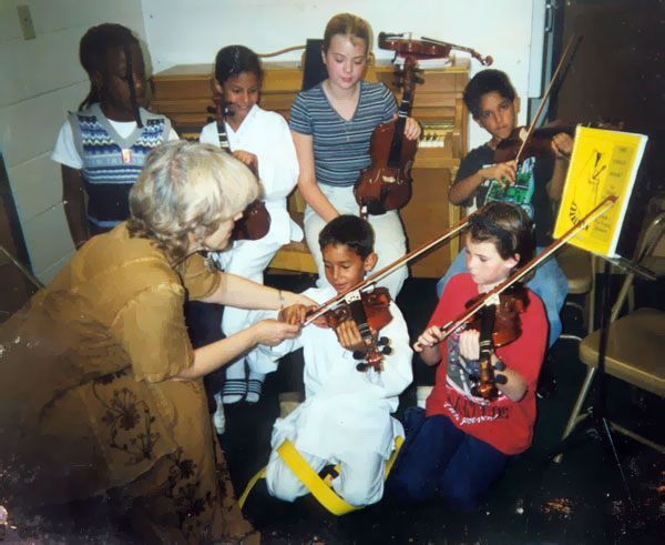 Students gather around Professor Eden Vaning to learn to bow correctly at the High Point YMCA Musical Alternatives Program